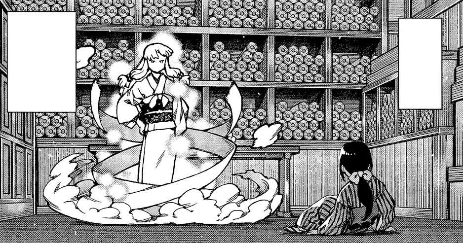 Wall Weave Shelter Formation (かきつづりつまごみの陣,,Kaki tsudzuri tsuma gomi no jin): Kiriha's ultimate defensive move. She constructs a multi-layered defensive covering that blocks projectiles from all sides and has an absurdly high defensive value, being capable of protecting even those close to her. It was strong enough to protect Kiriha and Kazuya, even from Kukuri's Minazuchi, but it is a very exhausting technique that depletes most of the user's stamina.