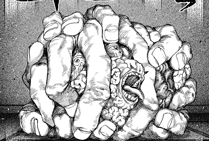 When suffering the side effect of overusing Puppet Binding, Masuji becomes a mold of undefined flesh sandwiched between multiple large fingers.